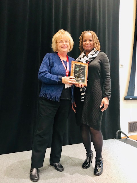 Patricia Cunningham, MSN, MBM, RN, was presented with Indiana's School Nurse of the Year award at the NCAA Headquarters in Indianapolis recently. Pat is the school nurse coordinator for Merrillville Schools. Pat describes herself as "very passionate when it comes to nursing, teaching, and serving the community. I love school nursing, but I love my students more. I consider my vocation as more than a job or a career; I consider it a ministry." She adds, "I do not see my students where they are today; I see my students as how they will be in the future--nurses, doctors, lawyers, and teachers." She loves former Surgeon General Joycelyn Elders' quote: "You cannot educate a child who is not healthy, and you cannot keep a child healthy who is not educated." Pat was named to the IASN School Nurse Leadership Academy in 2018. Pat (R) is pictured receiving her plaque from outgoing IASN President Lynn Stoelting (L).
