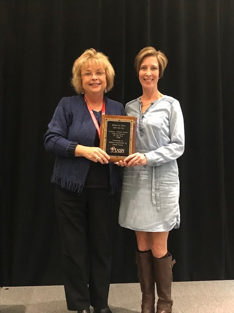 Rebecca West was named School Nurse Administrator of the Year at IASN's annual meeting. Rebecca notes that she uses Lina Rogers as her model for school nursing excellence. Rogers focused on reducing absenteeism through education and home visits; Rebecca emphasizes the importance of education in her clinical work. She also visits home, doctors' offices, hospitals, and anywhere else her students and their families need an advocate to help them attend school regularly and safely. Some of Rebecca's other accomplishments include: implementing electronic IHPs, automatic bus notification system for students with IHPs, improved safety mechanisms for identifying students who take medications at school and for those with life-threatening allergies. Rebecca obtained her national certification in school nursing this year and encourages her peers to pursue certification--"If I can do it, you can do it." She is working with her nursing team this year on social determinants of health and clinical outcomes. Rebecca is pictured below (R) receiving her plaque from IASN's outgoing President, Lynn Stoelting (L).